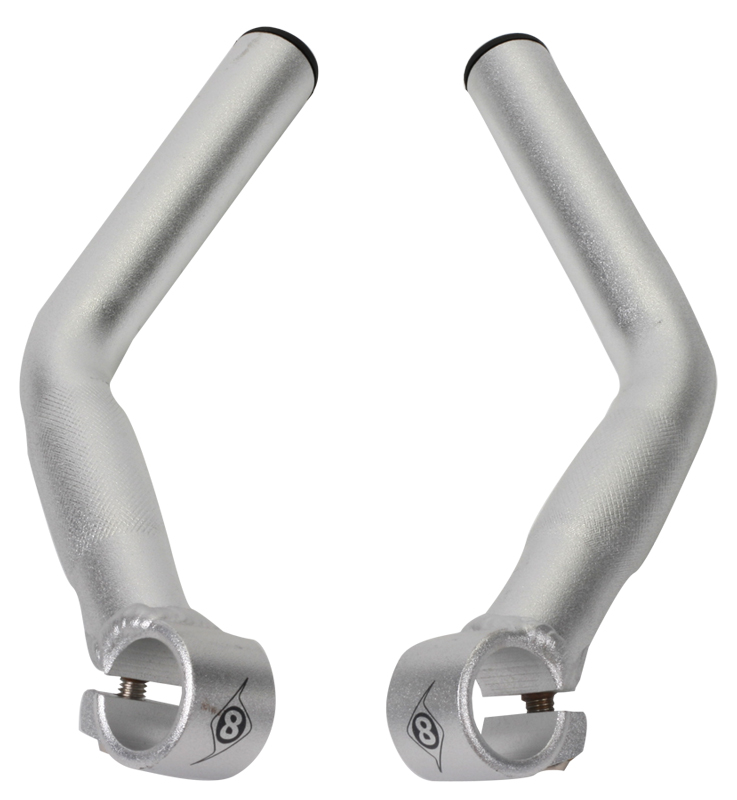 Origin-8's Pro Pulsion Compe-Lite Bar Ends are made of light and durable aluminum with strong forged clamps and a shot-peened Black or polished Silver finish. They are ergonomically shaped, textured for a great grip and come in Long and Short.